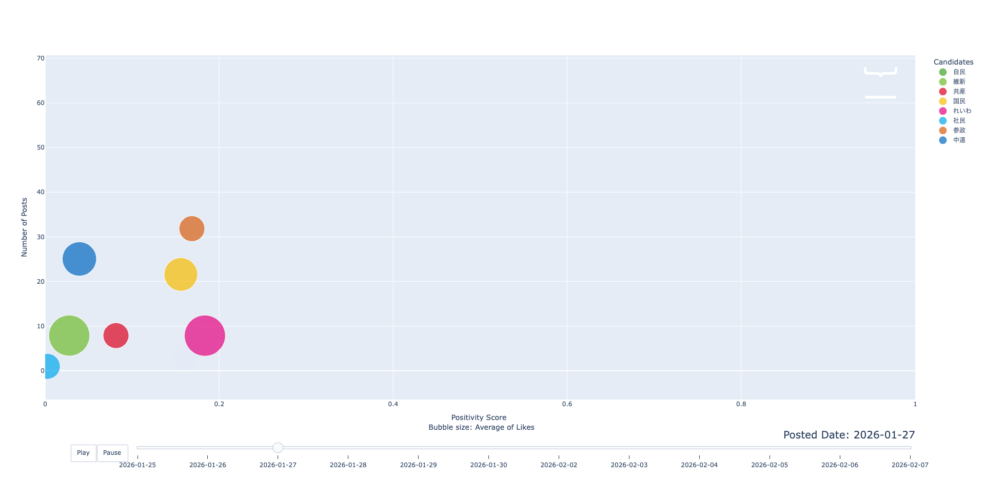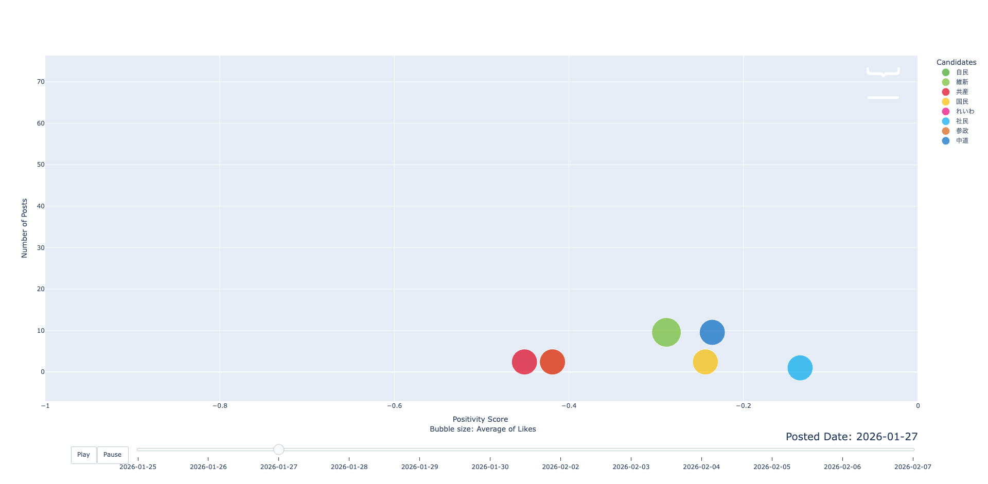 衆議院選挙におけるX上の投稿を収集し、独自のアルゴリズムで分析、可視化中。