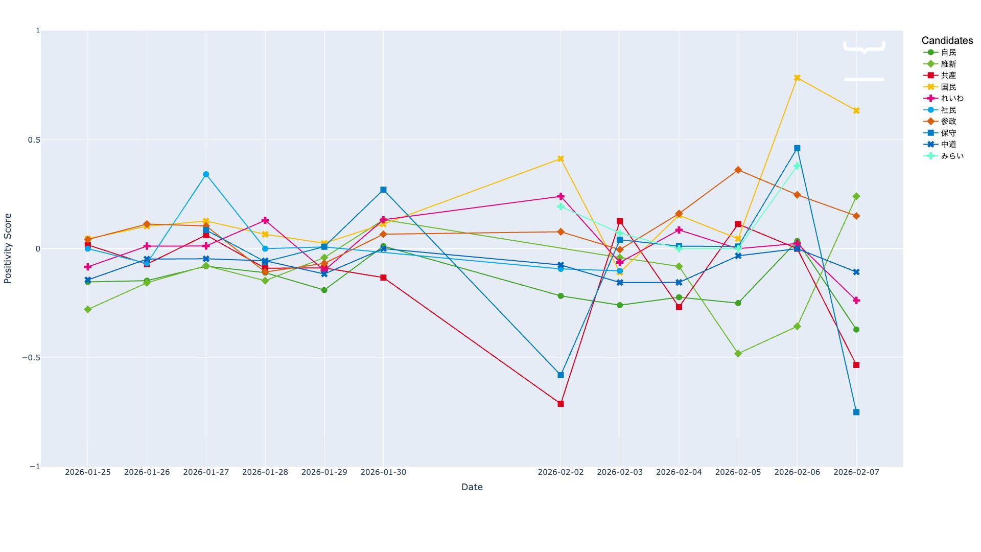 候補者ごとのポジティブ度合いを日次で可視化しています。